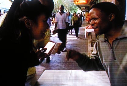 路上でカセットテープを売っているおじさんと値段交渉をする詠美さん。