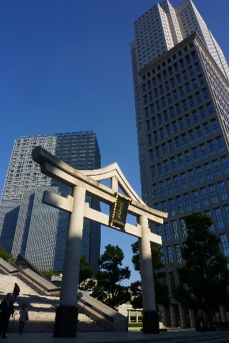 日枝神社入口から見た風景。左側が旧ヒルトンホテル、現在の TOKYU CAPITOL TOWER、そして右側の高い建物が山王ホテル。現在の山王パークタワーである。